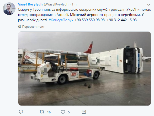 "Смерч в Турции: по информации экстренных служб, граждан Украины нет среди пострадавших в Анталии. Местный аэропорт работает с перебоями", - написал Кирилич.