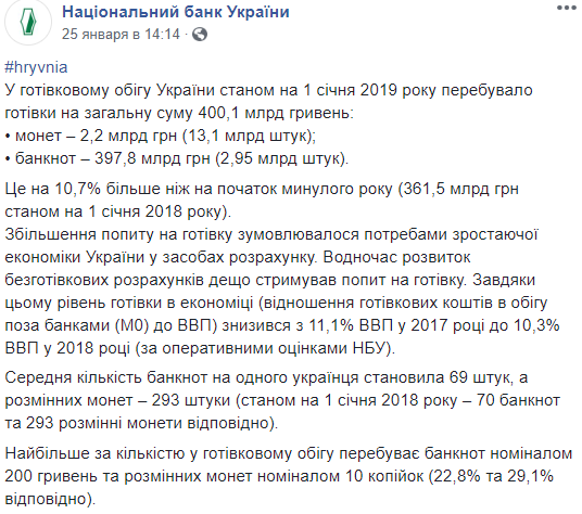 В наличном обороте Украины по состоянию на 1 января 2019 года находилось 400,1 млрд гривен. Об этом сообщает пресс-служба регулятора на странице в Facebook.