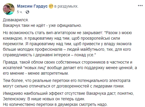 "Довакарился. Вакарчук таки не идёт - уже официально. Но возможность стать вип-агитатором не закрывает: "Разом з моєю командою, я працюватиму над тим, щоб проєвропейські сили перемогли. Я працюватиму над тим, щоб привести у владу якомога більше молодих професіоналів – людей майбутнього, тих, для кого справедливість і державні інтереси – понад усе."