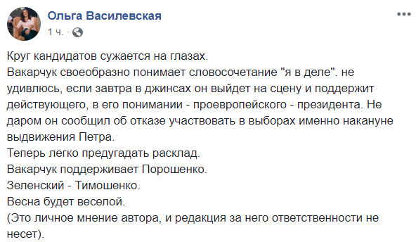 "Вакарчук своеобразно понимает словосочетание "я в деле". не удивлюсь, если завтра в джинсах он выйдет на сцену и поддержит действующего, в его понимании - проевропейского - президента. Не даром он сообщил об отказе участвовать в выборах именно накануне выдвижения Петра.
