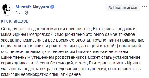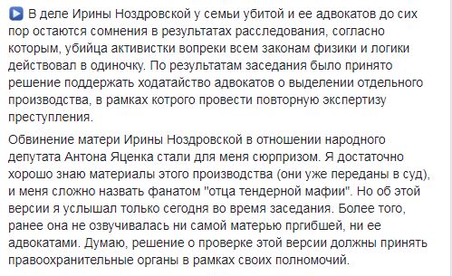 "Обвинение матери Ирины Ноздровской в отношении народного депутата Антона Яценка стали для меня сюрпризом", - написал он. По словам нардепа, он хорошо знает материалы этого производства, но об этой версии услышал только в понедельник во время заседания ВСК. Найем пишет, что ранее такую версию не озвучивали ни родственники погибшей, ни ее адвокатами. "Думаю, решение о проверке этой версии должны принять правоохранительные органы в рамках своих полномочий", - сообщил нардеп.