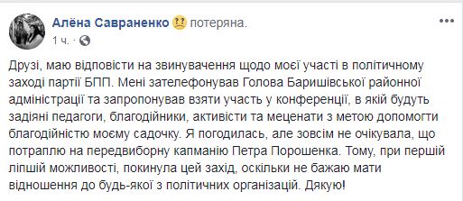 "Друзья, должна ответить на обвинение относительно моего участия в политическом мероприятии партии БПП. Мне позвонил председатель Барышевской районной администрации и предложил принять участие в конференции, в которой будут задействованы педагоги, благотворители, активисты и меценаты с целью помочь благотворительностью моем саду. Я согласилась, но совсем не ожидала, что попаду на предвыборную кампанию Петра Порошенко", - заявила популярная исполнительница.