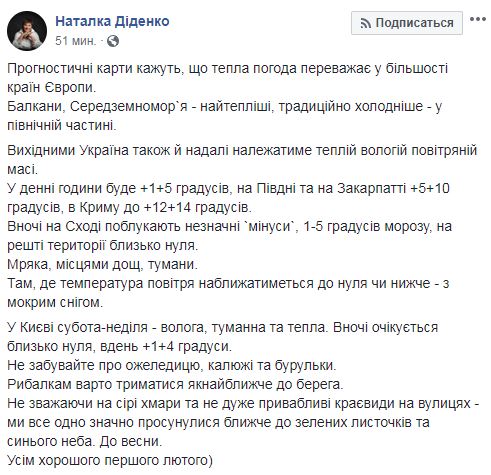 На территории Украины в выходные дни, 2 и 3 февраля, ожидается теплая погода, благодаря влажной воздушной массе. Об этом синоптик Наталья Диденко написала в Facebook.