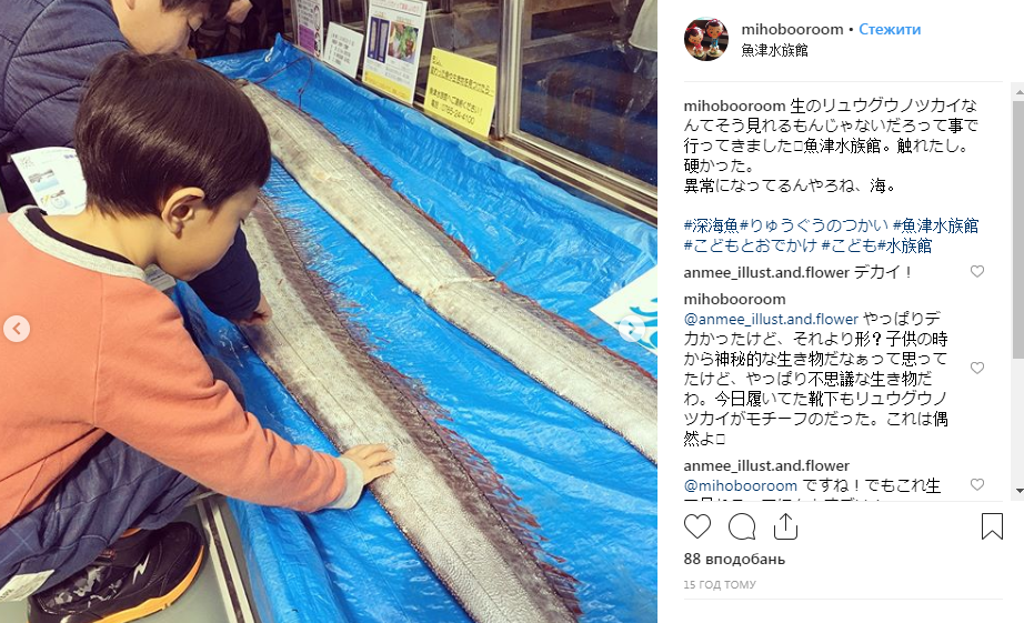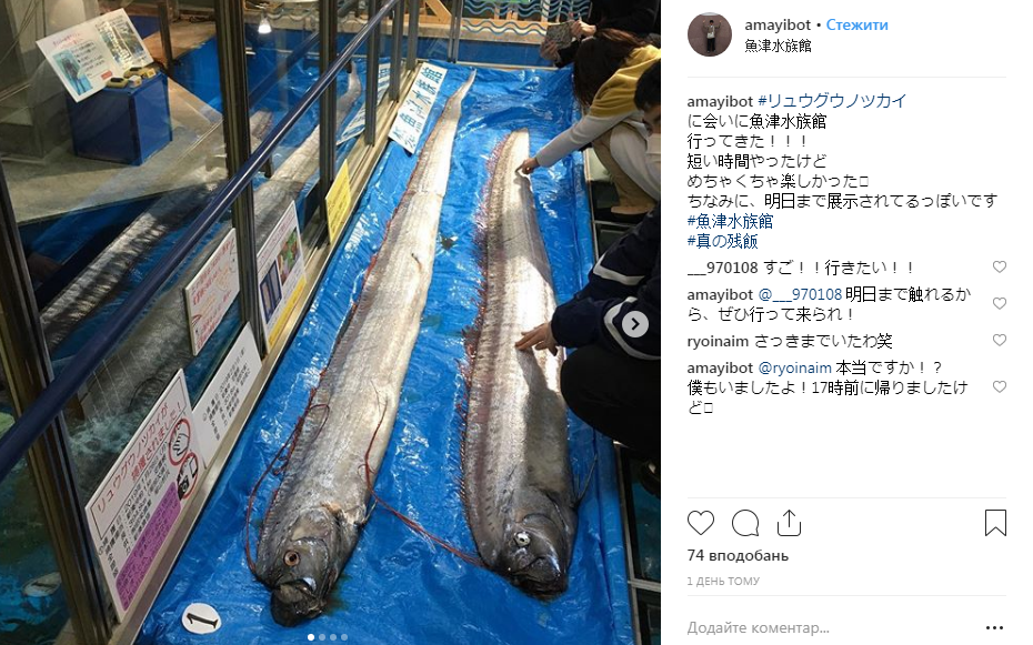 В Японии на побережье залива Тояма выбросился огромный сельдяной король длиной в 3,2 метра. Фото редкой рыбы опубликовали в Instagram.
