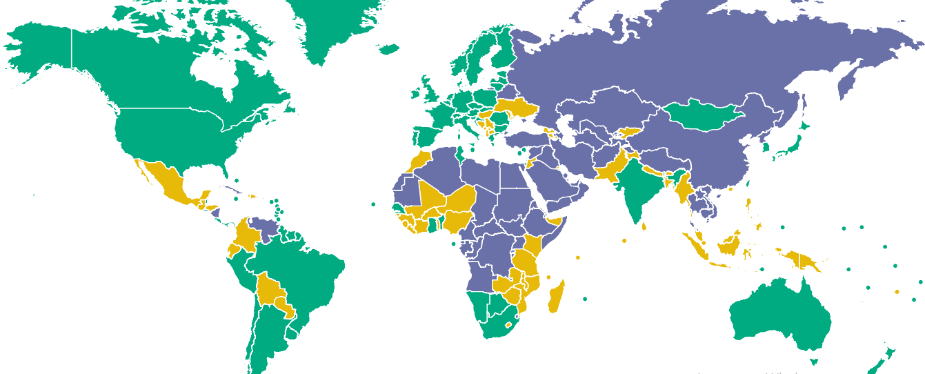 Зеленый - свободные страны; желтый - частично свободные, фиолетовый - несвободные Фото: freedomhouse.org
