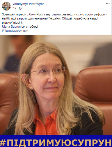Глава Украинского института Национальной памяти Владимир Вятрович поддержал отстраненную решением суда от должности и.о. министра здравоохранения Ульяну Супрун и заявил, что разгоревшийся вокруг чиновницы-иностранки не что иное, как проявление российской агрессии. Об этом он написал на своей странице в соцсети.