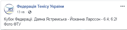 И в первом поединке наша Даяна Ястремская в двух сетах обыграла шведку Юханну Ларссон. На второй подаче Ларссон наша теннисистка выиграла брейкпоинт. Соперница попыталась забрать ответные подачи, но украинка выиграла вырвала победу в гейме. Во втором сете Ястремская уверенно разгромила соперницу, добыв первую победу на Кубке Федераций - 6 - 4, 6- 2.