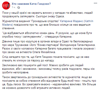 Активисты, которые следят за расследованием убийства активистки Екатерины Гандзюк, отмечают в соцсети, что Екатерина Маденс пишет о коррупции в органах власти в Одессе и непосредственно о мэре Геннадии Труханове и его "бизнес-партнере" ​​Владимире Галантернике.