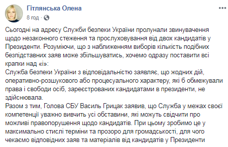 "В адрес Службы безопасности Украины прозвучали обвинения в незаконной слежке и прослушивании от двух кандидатов в президенты. Понимая, что с приближением выборов количество подобных безосновательных заявлений может увеличиваться, хотим сразу поставить все точки над "I".