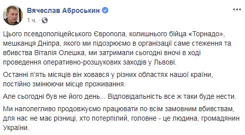 "Этого псевдополицейского Европола, бывшего бойца "Торнадо", жителя Днепра, которого мы подозреваем в организации именно наблюдения и убийства Виталия Олешко, мы задержали сегодня ночью в ходе проведения оперативно-розыскных мероприятий во Львове", - написал он. Подозреваемый 5 месяцев скрывался от следствия в разных регионах страны.