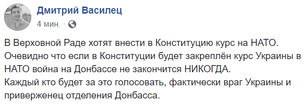 10:50  "В Верховной Раде хотят внести в Конституцию курс на НАТО. Очевидно что если в Конституции будет закреплён курс Украины в НАТО война на Донбассе не закончится никогда.