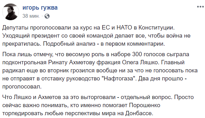 Что Ляшко и Ахметов за это выторговали - отдельный вопрос. Просто сейчас важно понимать, кто именно помогает Порошенко торпедировать любые перспективы мира на Донбассе", - пишет главный редактор "Страны" Игорь Гужва.