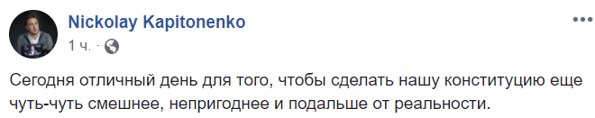 10:10  "Сегодня отличный день для того, чтобы сделать нашу конституцию еще чуть-чуть смешнее, непригоднее и подальше от реальности", - пишет в Facebook политолог Николай Капитоненко.