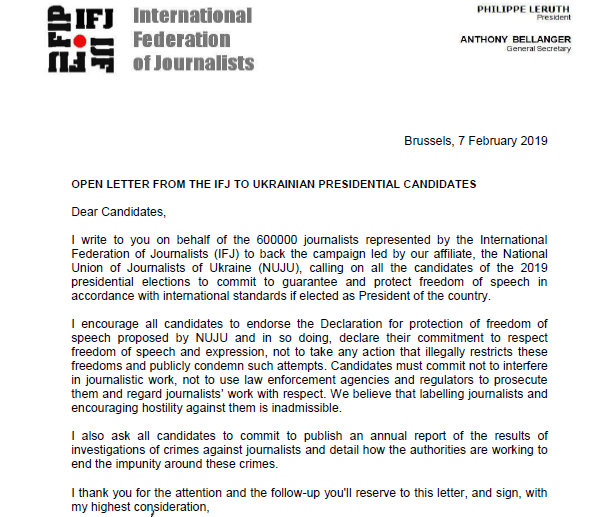 Каждый кандидат в президенты Украины в случае избрания на должность должен гарантировать и защищать свободу слова. Об этом говорится в открытом письме президента Международной федерации журналистов Филиппа Ляруша к участникам президентских выборов в Украине. В МФЖ отметили поддержку инициативы Национального союза журналистов Украины принимать от кандидатов публичные обязательства, изложенные в Декларации в защиту свободы слова.