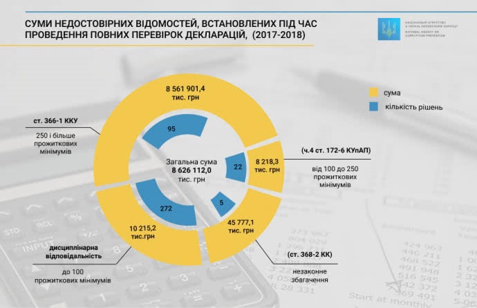 Национальное агентство по предупреждению коррупции (НАПК) сообщает, что должностные лица в своих декларациях указали недостоверные сведения на общую сумму более 8,6 миллиарда гривен. Об этом сообщает пресс-служба НАПК.