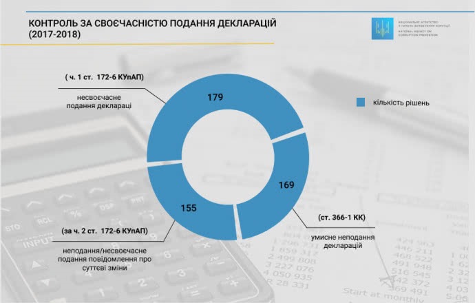 Отмечается, что в течение 2017-2018 годов в сфере финансового контроля агентство составило 273 обоснованных заключения, из них 99 - за декларирование недостоверных сведений, 5 - за незаконное обогащение, 169 - за умышленное непредоставление деклараций. Согласно закону, только в 2018 году, направлено обоснованных заключений в НАБУ - 40, в Национальную полицию - 178 и в органы прокуратуры - 36.