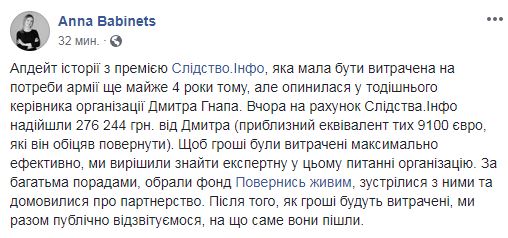 "Апдейт истории с премией Слідство.Інфо, которая должна быть потрачена на нужды армии еще почти 4 года назад, но оказалась у тогдашнего руководителя организации Дмитрия Гнапа. Вчера на счет Слідство.Інфо поступили 276 244 грн. от Дмитрия (примерный эквивалент тех 9100 евро, которые он обещал вернуть)", - написала она.