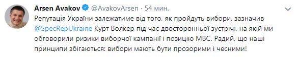 "Репутация Украины будет зависеть от того, как пройдут выборы, отметил спецпредставитель США Курт Волкер во время двусторонней встречи, на которой мы обсудили риски избирательной кампании и позицию МВД. Рад, что наши принципы совпадают: выборы должны быть прозрачными и честными!", - написал глава МВД, который находится в США.