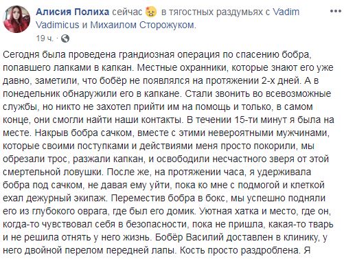"Местные охранники, которые знают его уже давно, заметили, что бобер не появлялся на протяжении 2-х дней. А в понедельник обнаружили его в капкане", - рассказала Полиха. По словам спасательницы, "всевозможные службы" отказывали охранник в помощи, пока они не нашли контакты организации.