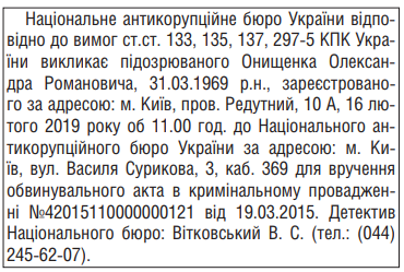Национальное антикоррупционное бюро (НАБУ) вызывает для вручения обвинительного акта беглого нардепа Александра Онищенко, подозреваемого в создании незаконной газовой схемы. Об этом свидетельствует повестка, опубликованная в официальной правительственной газете "Урядовый курьер", пишет Украинская правда.