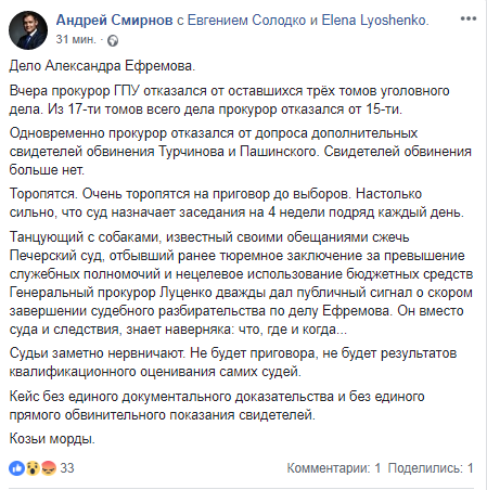 "Торопятся. Очень торопятся на приговор до выборов. Настолько сильно, что суд назначает заседания на 4 недели подряд каждый день. Танцующий с собаками, известный своими обещаниями сжечь Печерский суд, отбывший ранее тюремное заключение за превышение служебных полномочий и нецелевое использование бюджетных средств Генеральный прокурор Луценко дважды дал публичный сигнал о скором завершении судебного разбирательства по делу Ефремова. Он вместо суда и следствия, знает наверняка: что, где и когда...", - пишет Андрей Смирнов.