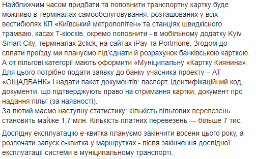 В ближайшее время приобрести и пополнить транспортную карту будет возможно в терминалах самообслуживания, расположенных во всех вестибюлях КП "Киевский метрополитен" и станциях скоростного трамвая, кассах Т-киосков, отдельно пополнить - в мобильном приложении Kyiv Smart City, терминалах 2click, на сайтах iPay и Portmone . Также планируют сделать расчет банковской карточкой.