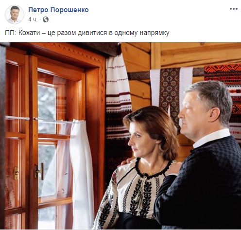 Так, президент Петр Порошенко выложил фотографию с женой Мариной и подписал ее так: "Любовь - это вместе смотреть в одном направлении".