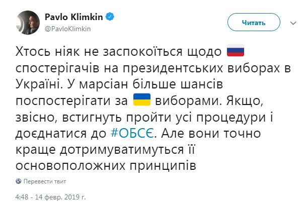 Министр иностранных дел Украины Павел Климкин заявил, что больше шансов быть наблюдателями на президентских выборах в Украине у марсиан, чем у россиян. Об этом он написал в Twitter.