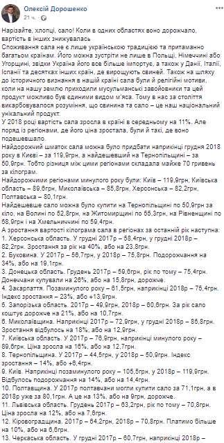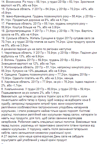"Самый дорогой кусок сала можно было приобрести в конце декабря 2018 года в Киеве - по 119,9 грн, а самый дешевый в Тернопольской области - по 50,9 грн. То есть разница между этими регионами составляла почти 70 гривен за килограмм", - говорится в сообщении.