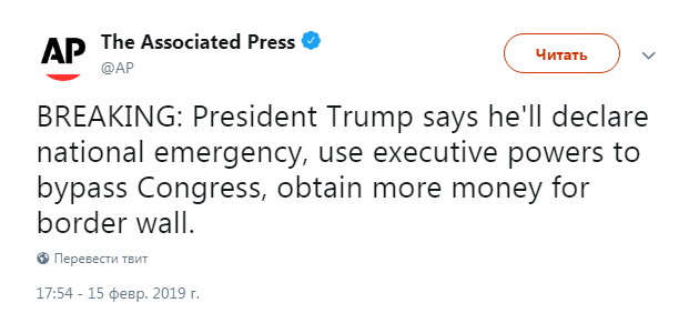 Президент Дональд Трамп заявил, что он введет режим чрезвычайного положения в США, чтобы добиться выделения денег на строительство стены на южной границе США в обход Конгресса. Об этом в Twitter пишет Associated Press.