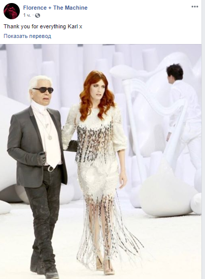 Вокалистка британской группы "Florence and the MachineЙ" Флоренс Уэлч написала: "Спасибо тебе за все, Карл".