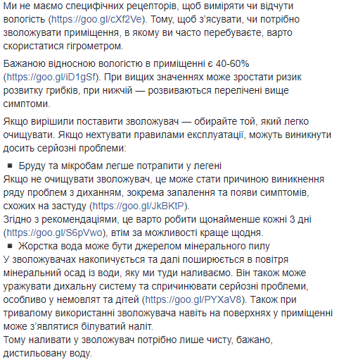 "Желательная относительная влажность в помещении - 40-60%. При более высоких значениях может возрастать риск развития грибков, при более низкой - развиваются перечисленные выше симптомы", - пишет чиновница в Facebook.