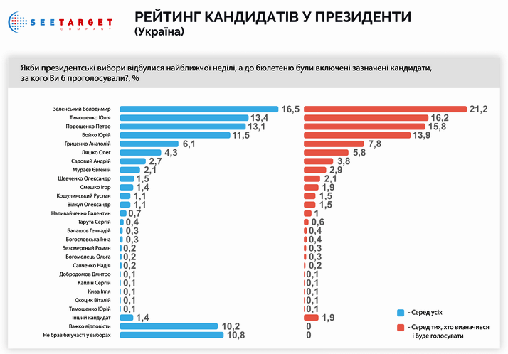 В другом опросе, проведенном компанией Seetarget, первое место также занимает Владимир Зеленский. однако его отрыв более значительный. Второе место за лидером ВО "Батькивщина" Юлией Тимошенко. Петр Порошенко лишь на третьем месте, причем с небольшим отрывом (менее 2 процентов) от него идет Юрий Бойко.