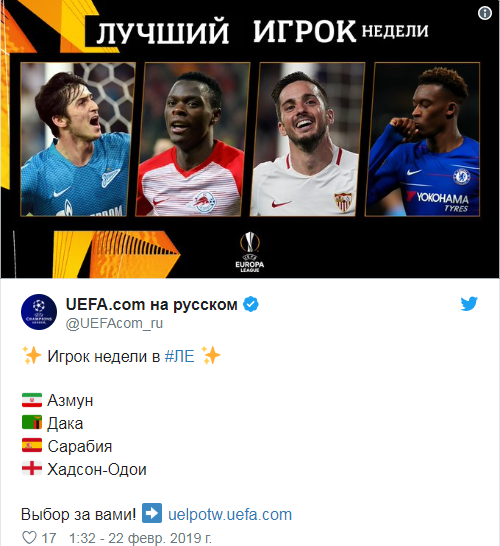 В квартет достойных вошли: форвард Зенита Сердар Азмун, нападающий Ред Булла Патсон Дака, полузащитник Севильи Пабло Сарабия и хавбек Челси Каллум Хадсон-Одои, передает официальный Twitter УЕФА.