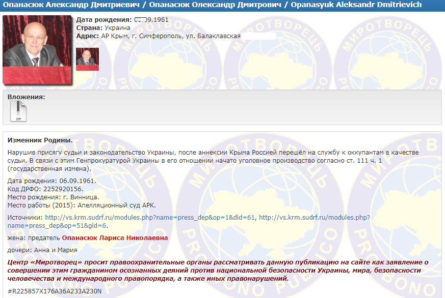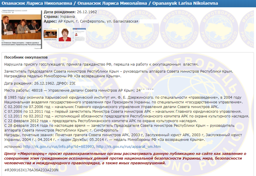 "Миротворец" внес их в свой "реестр", так как Лариса Опанасюк "нарушила присягу госслужащего, приняла гражданство РФ, перешла на работу к оккупированным властям", а ее супруг "нарушил присягу судьи и законодательства Украины" и "перешел на службу к оккупантам в качестве судьи".
