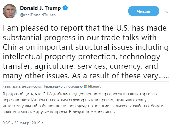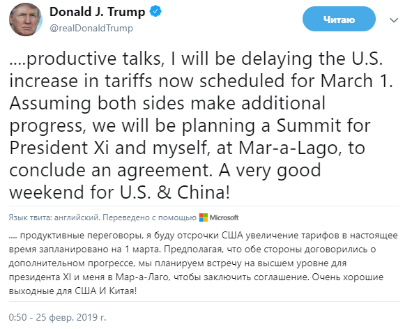 Президент США Дональд Трамп отсрочил введение новых пошлин на китайские товары после продуктивных переговоров с китайским лидером Си Цзиньпином. Об этом он сообщил на своей странице в Twitter.