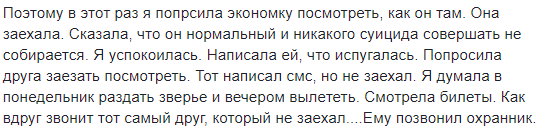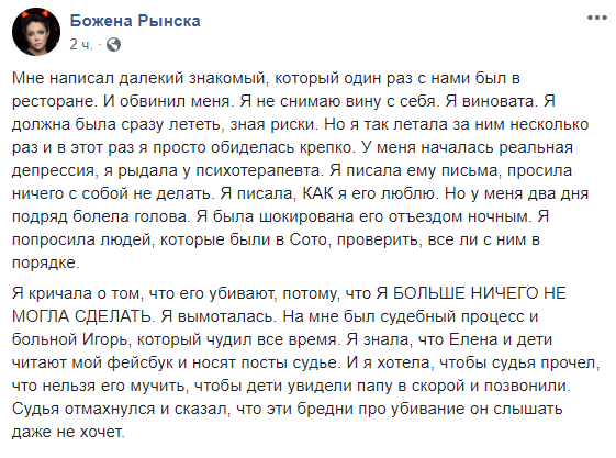 "Я писала, КАК я его люблю. Но у меня два дня подряд болела голова. Я была шокирована его отъездом ночным. Я попросила людей, которые были в Сото, проверить, все ли с ним в порядке. Я кричала о том, что его убивают, потому, что Я БОЛЬШЕ НИЧЕГО НЕ МОГЛА СДЕЛАТЬ. Я вымоталась. На мне был судебный процесс и больной Игорь, который чудил все время....", - добавила она.