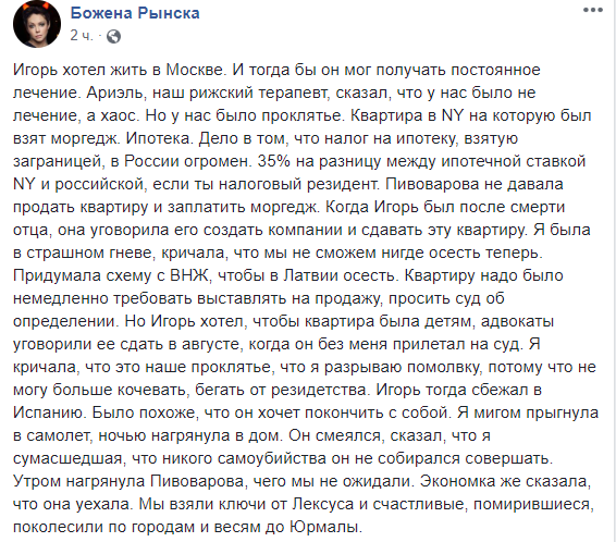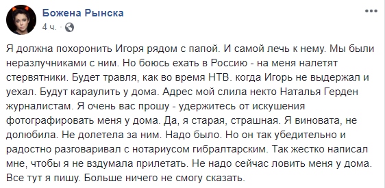 "Будет травля, как во время НТВ. Когда Игорь не выдержал и уехал. Будут караулить у дома... Да, я старая, страшная. Я виновата, не долюбила. Не долетела за ним. Надо было. Но он так убедительно и радостно разговаривал с нотариусом гибралтарским. Так жестко написал мне, чтобы я не вздумала прилетать. Не надо сейчас ловить меня у дома. Все тут я пишу. Больше ничего не смогу сказать", - с горечью рассказала Рынска.