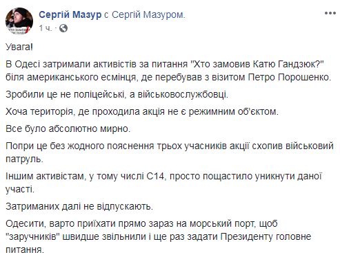 У американского эсминца в Одессе задержали активистов, которые спросили у Порошенко: "Кто заказал Катю Ганздюк?"