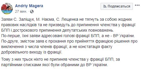 "Заявления Залищук, Найема, Лещенко не влекут за собой никаких правовых последствий и не приведут к прекращению членства во фракции БПП и досрочного прекращения депутатских полномочий. Во-первых, их заявления адресованы главе фракции БПП, а не ВР Украины. Во-вторых, содержанием заявлений есть просьба о принятия фракцией решения об исключении из числа членов фракции, а не констатация факта добровольного выхода из фракции", - напиал Магера. Он делает вывод,  "из них троих никто не прекращал членства во фракции БПП, по партийным спискам которой были избраны в ВР Украины".