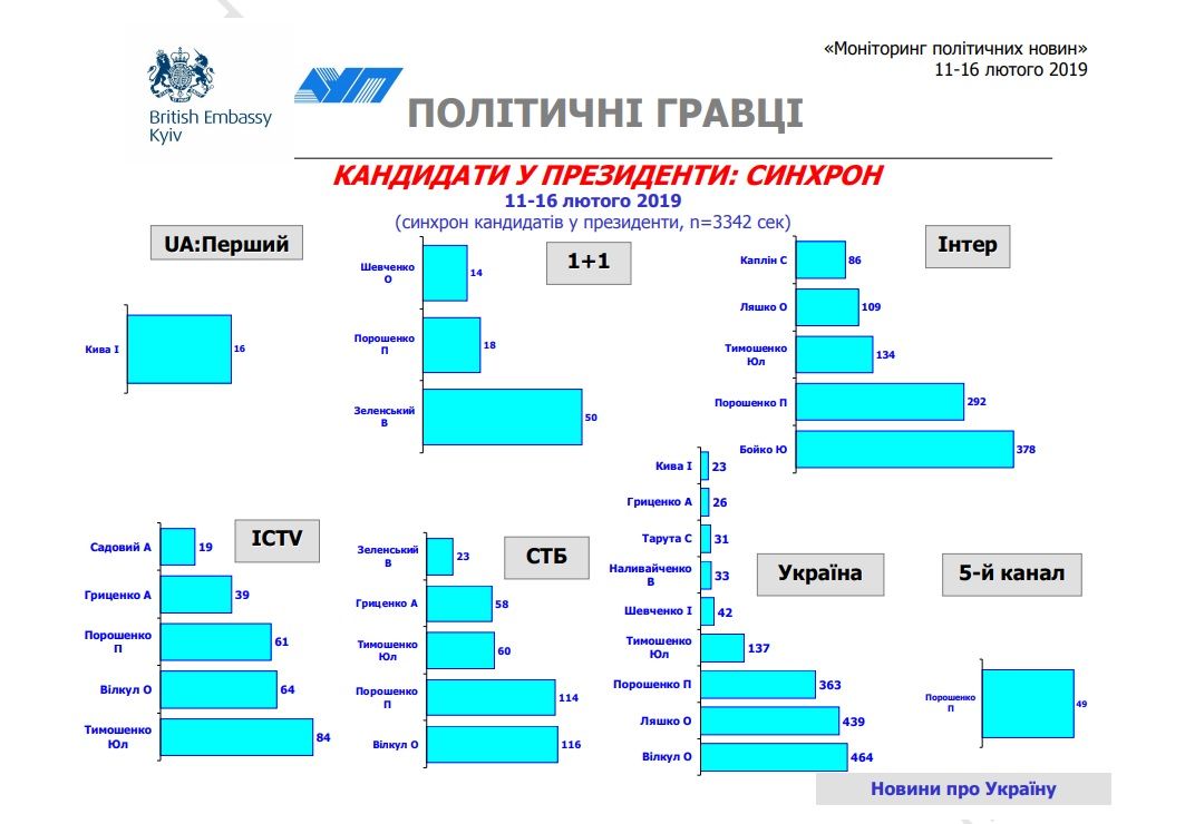 "Речь идет не об упоминании кандидатов, а когда они просто говорят сами. Эти показатели не совпадают. Например, на НТКУ упоминают Петра Порошенко, но синхронов его нет. И каналы довольно сегментированы по этому показателю", - подчеркнула она.