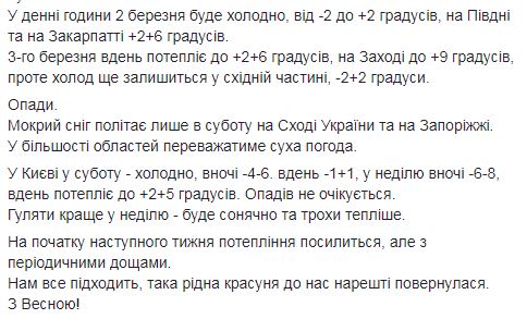 "Ночью предполагается -3...-8 градусов, в Сумской и Харьковской областях, вероятно, до -9...-12 градусов. На юге - около нуля. В дневные часы 2 марта будет холодно, от -2 до +2 градусов, на юге и на Закарпатье +2...+6 градусов. 3-го марта днем потеплеет до +2...+6 градусов, на Западе до +9 градусов, однако холод еще останется в восточной части, -2...+2 градуса", - сообщает Диденко.