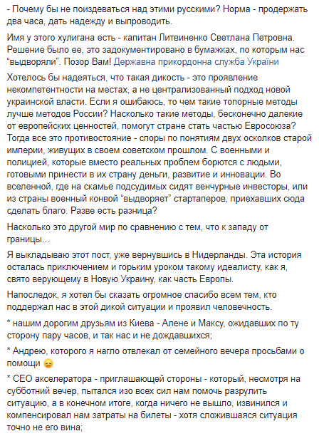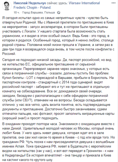 "Я сегодня испытал одно из самых неприятных чувств - чувство быть отвергнутым Родиной. Мы с Иванкой прилетели по приглашению в Киев на мероприятие - запуск акселератора, в котором были приглашены участвовать с Локали. У нашего стартапа была возможность стать украинским, и я видел в этом особый смысл. Ведь Киев - это город, в котором я родился. Особенный город, который я нежно люблю, столица родной страны. Половина моей жизни прошла в Украине, а затем раз в два-три года я возвращался сюда вновь, в том числе после конфликта с Россией", - написал Недельчук.