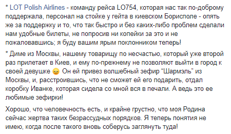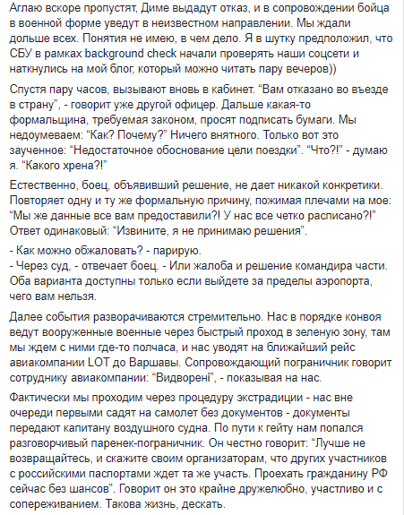 "Фактически мы проходим через процедуру экстрадиции - нас вне очереди первыми садят на самолет без документов - документы передают капитану воздушного судна. По пути к гейту нам попался разговорчивый паренек-пограничник. Он честно говорит: "Лучше не возвращайтесь, и скажите своим организаторам, что других участников с российскими паспортами ждет та же участь. Проехать гражданину РФ сейчас без шансов". Говорит он это крайне дружелюбно, участливо и с сопереживанием. Такова жизнь, дескать", - пишет Недельчук.