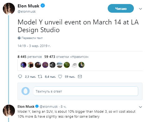 По словам Маска, Model Y получит "нормальные" двери в отличие от дверей "Крылья Сокола", которые установлены на Model X. Также Model Y будет стоить примерно на 10% дороже, чем Model 3, поскольку это более крупный внедорожник.