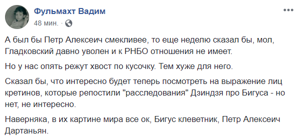"А был бы Петр Алексеич смекливее, то еще неделю сказал бы, мол, Гладковский давно уволен и к РНБО отношения не имеет.
