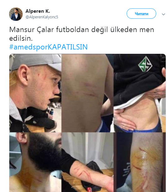 Одному из соперников из клуба Сакарьяспор Мансур Чалар даже порезал лицо. Видео распространил ресурс Yeni Şafak в своем Twitter.  На нем четко видно, как игрок под 72 номером наносит уколы соперникам каким-то предметом.