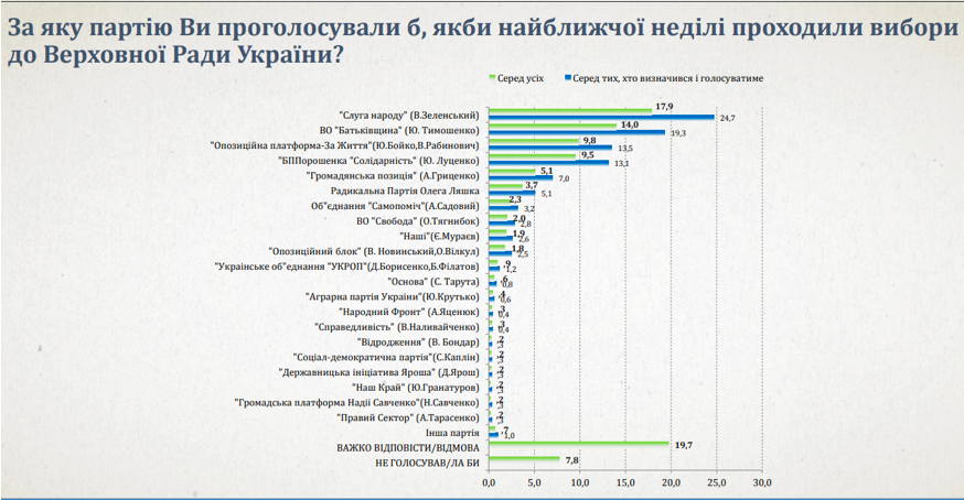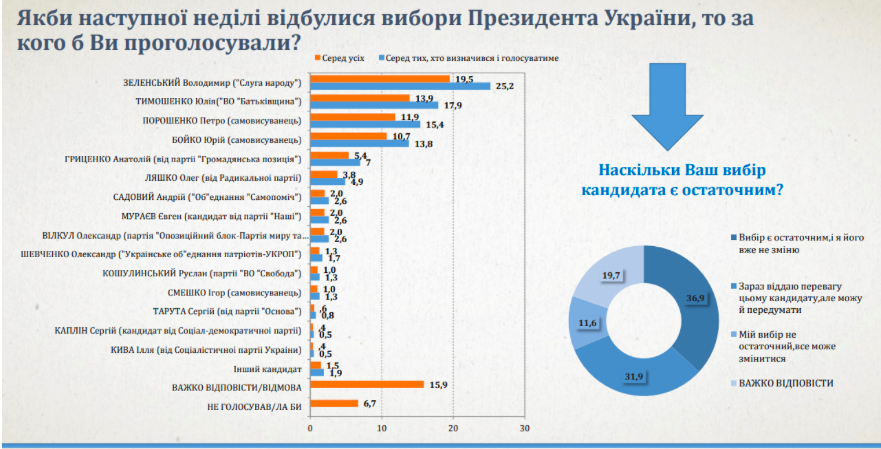 Если бы президентские выборы прошли в это воскресенье, то украинцы, которые точно пойдут на избирательные участки, проголосовали бы так: Владимир Зеленский – 25,2%, Юлия Тимошенко – 17,9%, Петр Порошенко – 15,4%, Юрий Бойко – 13,8%, Анатолий Гриценко – 7%.