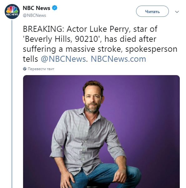 Американский киноактер Люк Перри скончался в возрасте 52 лет. Об этом сообщает NBC News в Twitter.