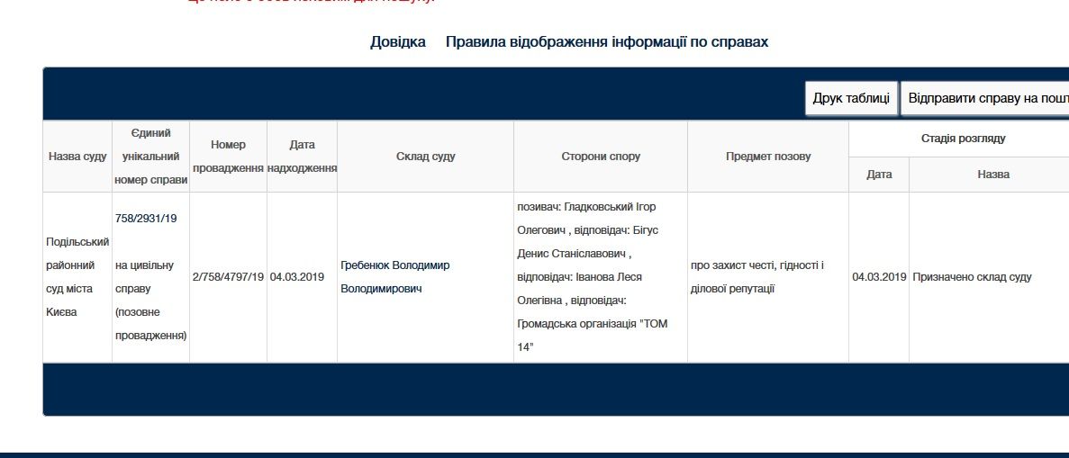 Так, в понедельник, 4 марта, Игорь Гладковский подал в суд по поводу защиты чести и достоинства. Ответчиками являются руководитель программы "Наші гроши" Денис Бигус и журналист-расследователь Леся Иванова. Дело будет рассматривать судья Владимир Гребенюк.